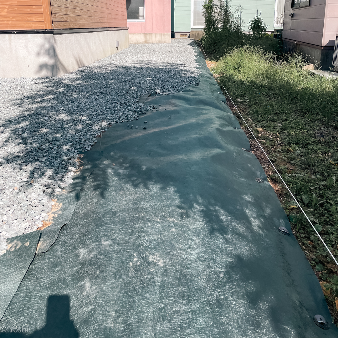 防草シートの紫外線から保護する目的・水はけをよくし美観を整えるため砕石を敷き込み