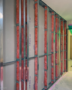 まず既存の壁を解体し、下地の軽量鉄骨内部に吸音材を隙間なく充填しました。