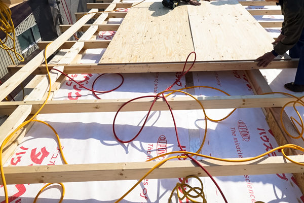 屋根形状を変えるついでに水平構面の耐震強化と気密性能を同時にUPさせるために、桁上合板を敷いています。