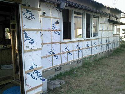 南側、外壁を張り替えする部分の防水透湿シート施工