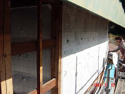 そのシートを更にしっかり胴縁で止める。サイディングを張らないこの状態で、何年でも台風がきても雨水は入らないように施工する。そして、風雨にさらされても大丈夫(耐久試験済みで、その中でも一番耐久性の信頼できる素材)な資材を選んで使用している。