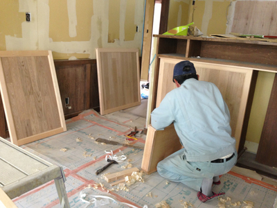 D様宅は造作収納や建具などが多く、建具職人さんのHさんも大活躍です!
