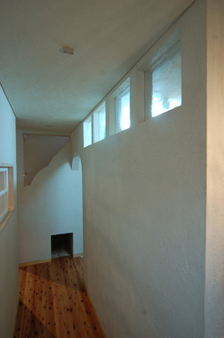 今回は岩手産のクラフトマン(薪専用タイプ)を使用。床はテラコッタタイルに撥水オイル塗装しています。約4m2のタイル下は床下までコンクリートとなっており、冬期間の蓄熱槽として活躍してくれます。天井部分は簀の子状にして暖気を家中に送る。上がった暖気は北側の階段室を下って廊下上の通風口からリビングへ戻る。