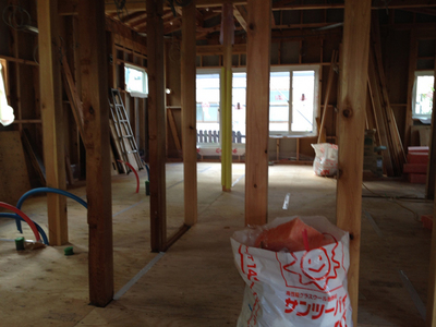 グラスウールの施工後に構造用合板@28の施工、間仕切り壁を施工にすることで、広い空間の床板を一気に施工することができますね。